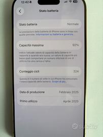 Vendo iPhone 16 Pro colore titanio sabbia, da 256 giga ancora in garanzia, completo di scatola e cavo di alimentazione. Batteria ancora ottima come nuova (non spedisco) solo di persona.