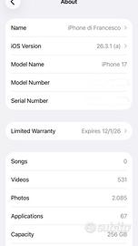 iPhone 17 – 256 GB – Grigio scuro Vendo iPhone 17 da 256 GB in ottime condizioni, perfettamente funzionante e utilizzato sempre con cura. Il telefono presenta: * Display in ottimo stato, senza graffi evidenti * Retro e fotocamere in condizioni eccellenti * Tutte le funzionalità operative (Face ID, audio, fotocamera, ecc.) 👉 Segnalo una piccolissima ammaccatura sul bordo, visibile in foto, che non compromette in alcun modo l’utilizzo del dispositivo. Ottima soluzione per chi cerca un l’ultimo modello di iphone, capiente e affidabile a un prezzo più conveniente.