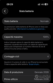 iPhone 17 Lavender 256gb acquistato ed attivato il 16 febbraio 2026, condizione nuovo, solo aperto e attivato. In data 28 marzo 2026 presenta 4 (quattro) cicli di ricarica batteria. Consegno la ricevuta/bollettina di Unieuro online. Chiedo solo euro 750,00 NON TRATTABILE. CONSEGNA A MANO. NON SPEDISCO E NON SCAMBIO.