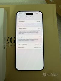 Apple Care+ fino a fine Settembre 2027 (copertura per: Danno accidentale, Sostituzione express, Accesso prioritario). Capacità batteria 100%