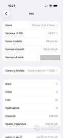 Marca: Apple Modello: iphone 17 air 256 Colore: nero Condizioni: grado A+++ Garanzia: 17/10/27 (scontrino) Prezzo: 800 non trattabile