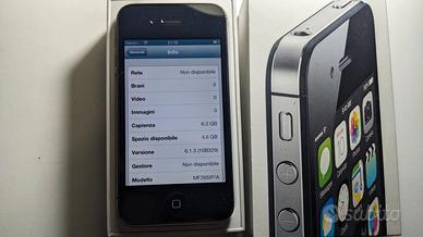 Apple iPhone 4S - 8GB - Nero (Sbloccato). È stato fatto downgrade alla versione 6.1.3. Il telefono in buono stato generale con qualche segno di utilizzo,funzionante in tutto. Batteria 79%. Si vende con libretti,cavo non originale e scatola con imei diverso. Per amanti di Apple e collezionisti.