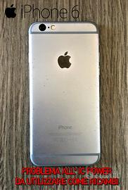 - Vendo iPhone 6 da 16 gb da utilizzare solo e unicamente per ricambi,il telefono funzionava perfettamente, ma all'improvviso si è spento, tenta di avviarsi solo collegato al caricabatterie, l'ho fatto controllare da un tecnico, e va' cambiato il chip IC POWER, ma data l'età non vale la pena, la riparazione costa più del telefono.