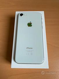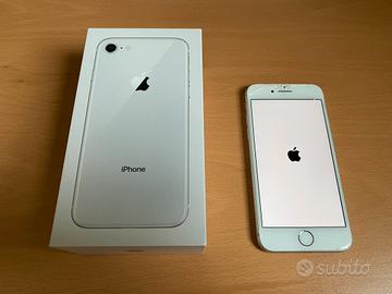 Come da foto, vendo iPhone 8 silver da 64Gb perfettamente funzionante. Il vetro superiore e' scheggiato nella parte alta e bassa dello schermo. Touch perfettamente funzionante.