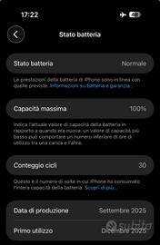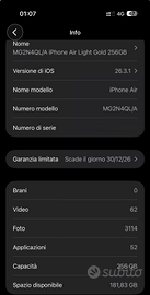 iPhone Air 256gb Light Gold acquistato il 30 dicembre 2025, condizione come nuovo con 30 cicli di ricarica (aggiornati al 23 aprile 2026). Consegno la ricevuta di pagamento di Amazon Italia. Aggiungo come regalo, quindi se non ti interessa il prezzo non cambia, una Battery MagSafe originale Apple condizioni nuova, solo aperta la scatola per verifica funzionamento (consegno la ricevuta anche di questa). Chiedo euro 790,00 non trattabili. Consegna a mano. NON SPEDISCO.