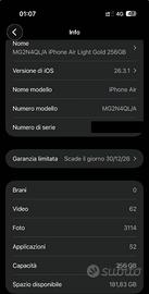 iPhone Air Light Gold 256gb con 21 cicli di ricarica batteria, completo di scatola, accessori e ricevuta di Amazon Italia.