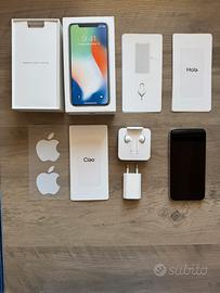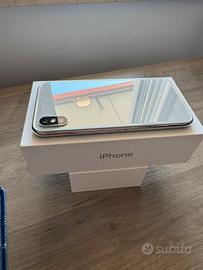 Apple iPhone X - 256GB - Argento/Bianco, usato ma in ottime condizioni, batteria al 72%. parte frontale e retro assolutamente perfetti, scocca laterale con piccoli segni non percepibili al tatto causate dalle varie cover che ho sempre utilizzato. Iphone in condizioni eccellenti come da foto. Completo di tutto, scatola originale, spilletta per la sim, auricolari (mai aperti e mai utilizzati) adattatore audio jack più cover e vetro temperato nuovo da applicare.