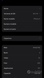 Vendo iPhone X da 256 GB in buone condizioni. L'unico difetto estetico è una piccola crepa sulla fotocamera posteriore, come visibile in foto, ma non compromette il funzionamento. La batteria è al 100% di capacità, perfettamente funzionante. Incluso con il telefono, la cover originale Apple in silicone, il cavo di ricarica e la spilletta per l'apertura della SIM. Prezzo trattabile