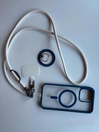 KIT ACCESSORI per IPHONE 15 - COLOR BLU E BIANCO - COMPOSTO DA COVER MAGSAFE TRASPARENTE CON BORDI BLU + ANELLO MAGNETICO BLU + LACCIO LUNGO ECOPELLE BIANCO