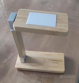 Lampada orologio sveglia multifunzione pieghevole in bambù color naturale, con touch screen retroilluminato e caricatore wireless integrato da 15W. Misure 8x18 cm, h 24 cm. Presente il brand "Duferco".