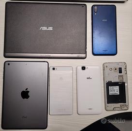 Vendo in lotto i seguenti telefoni: - Huawei p8 Lite funzionante, da sistemare il connettore di ricarica. - Tablet Asus Zenpad 10, dovrebbe funzionare ma è da mettere lo schermo, non sono a conoscenza di eventuale blocco schermo o Google. - iPad mini 2a gen da sostituire il pezzo con accensione, regolazione del volume e del tastino che permette di mutare o meno l'audio. - Samsung Galaxy Grand Prime funzionante senza batteria e backcover ma da rigenerare, ho visto ruggine sul connettore. - Due telefoni wiko da sistemare. Il difetto che presentano è che non caricano, vanno in assorbimento (come si può vedere dal powerbank che è in funzione in foto) ma non si accendono e non mostrano nulla a schermo. Suppongo sia un problema di batteria essendo che le schede in sé apparentemente funzionano visto che assorbono corrente. Preciso che alle condizioni attuali non sono funzionanti, sono riparabili, quindi vendo come non funzionante, condizioni estetiche visibili in foto. I modelli sono Wiko Rainbow e Wiko Y80. Non sono al corrente se hanno blocco schermo o altro, sicuramente sono da formattare. Non sono inoltre al corrente di ulteriori difetti, se presenti. - Samsung Galaxy Tab A sm-t555 VENDUTO Per qualsiasi dubbio o info contattatemi.