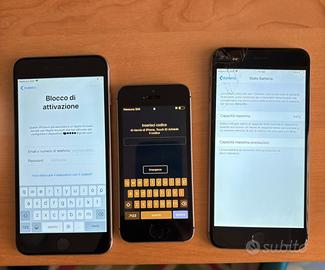 Vendo lotto di iPhone PER PARTI DI RICAMBIO in dettaglio: -iPhone 6 plus condizioni estetiche buone , normali segni di utilizzo, anche il display è buono, E’ presente blocco di attiviazione -iPhone SE, condizioni estetiche discrete presenta rottura angolo posteriore vicio alla fotocamera, il display sembra non rispondere al touch E’ presente blocco da codice -iPhone 6 plus condizioni estetiche della scocca ottime, Rottura come da foto del display nella parte fronatale in alto a sinistra. Apparentemente non ho riscontrato problemi nel funzionamento Batteria 94% modello 64 gb Tengo a precisare che vendo lotto come NON FUNZIONANTE, non ho effettuato prove approfondite potrebbero avere altri problemi oltre a quelli sopra. No scatole e accessori Se trovate l'annuncio on Line anche se "datato" significa che sono disponibili.