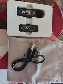 Microfono portatile a clip Boya wireless con attacco per IPhone e iPad. Nuovo, scatola aperta solo per verificarne il funzionamento. Portata 100 metri. Compreso nella confezione, cavo ricarica USB -C e sacchetto contenitivo