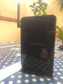 Vendo modem router N150 adsl Netgear, colore nero,x passaggio a fibra. Perfettamente funzionante.cavi inclusi!!+filtro x telefono