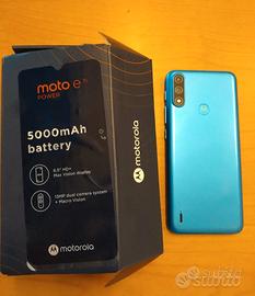 Motorola Moto E7i Power Dual-SIM 32GB Tahiti Blue Android Smartphone Motorola Moto E7i Power 2/32GB Tahiti Blue Android Smartphone. Il Motorola Moto E7i Power (spesso associato al "7i") monta un processore MediaTek Helio G25, display da 6.5 pollici HD+, RAM da 2 GB, memoria interna da 32 GB espandibile, doppia fotocamera posteriore (principale e macro) da 13+2 MP, fotocamera anteriore da 5 MP, batteria da 5000 mAh e Android 10. Specifiche principali Display: LCD Max Vision da 6,5 pollici con risoluzione HD+ (720 x 1600 pixel). Processore: Octa-Core MediaTek Helio G25. Memoria: 2 GB di RAM e 32 GB di storage interno, espandibile tramite microSD fino a 1 TB. Fotocamere: Posteriore: Doppia fotocamera da 13 MP (principale) + 2 MP (macro). Anteriore: 5 MP. Batteria: 5000 mAh con ricarica a 10W. Sistema Operativo: Android 10. Connettività: Wi-Fi, GPS, LTE 4G, Bluetooth. Sensori: Lettore di impronte digitali. Unico difetto schermo scheggiato nella parte superiore a destra, del resto funziona al 100% è praticamente nuovo, è stato resettato ai dati di fabbrica. Inoltre nel pacco oltre alla scatola originale troverete: Cavo USB Auricolari nuove mai usate consegna gratuita Roma metro A da Battistini a Termini