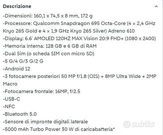 Ottimo smartphone MOTOROLA G82 5G grigio, memoria 128/6 GB ram, display 6,6' Amoled, dual-sim o sim+sd, aggiornato ad Android 13, usato poco e tenuto sempre con cover e pellicola sullo schermo. Batteria sempre usata con protezione di carica, comparto fotografico eccellente. In confezione originale con accessori originali, in più cover trasparente e nuova pellicola. Dettaglio caratteristiche in foto allegata, chiedere x altre foto o info. In alternativa a Subito, anche ritiro a mano a Como o in zona Erba(CO) o spedizione economica.