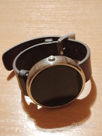 Smartwatch Motorola Moto 360 con cinturino in pelle marrone e ghiera color oro.. La batteria necessita di essere sostituita