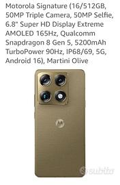 Vendo nuovissimo Motorola Signature 512 GB Tripla camera Sound by BOSE colore Martini Olive ancora sigillato come da foto con garanzia attiva.