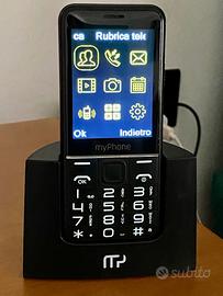 Marca myPhone - Modello Halo Q - Colore Nero - DualSim - Display 2.8" a colori, UMTS, Tasto SOS - Fotocamera, Bluetooth, completo della base per ricarica batteria e relativo cavo usb. Dimensioni (altezza x larghezza x spessore): 130.00 x 56.00 x 13. Peso: 110.00 grammi. Cellulare di facile utilizzo adatto per le persone anziane.