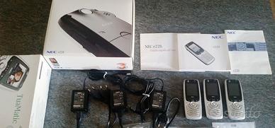 N.3 Videofonini Nec e228 UMTS (Videochiamate) funzionanti brandizzati 3 completi di batteria e caricabatteria originali Nec Manuale di istruzioni vengono ceduti in una unica confezione originale del prodotto. In regalo un'altra batteria di riserva, un auricolare e caricabatteria 12V per auto. Sono conservati da tempo per cui non garantendo il perfetto stato e autonomia cedo in blocco a soli 30 euro (neanche il prezzo dei caricabatteria ed accessori) ideali anche per amatori e collezionisti, tutto come in foto.
