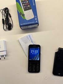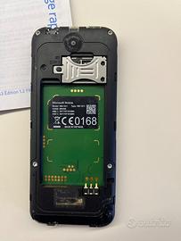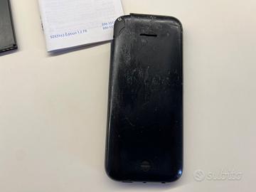 Nokia 225 Dual Sim RM-1011, colore nero, funzionante, in discrete condizioni, con cover posteriore danneggiata come visibile in foto e con residui di nastro adesivo. Incluso caricabatterie micro USB (non originale), cuffie (mai usate), scatola e libretto di istruzioni in francese. Codice di sicurezza assente.