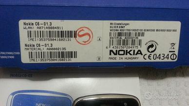 Cellulare NOKIA C6-01 silver; perfetto e funzionante, corpo in alluminio. fotocamera 8 megapixel, flash a doppio led, zoom digitale 2x, autofocus, fotocamera anteriore, wi-fi, bluetooth, GPS, UMTS, memoria espandibile con micro SD, batteria al litio, completo di scatola, manuale e scontrino. 2 caricabatterie a filo, cavo USB e caricabatterie x USB, auricolari tutto originale e funzionante.