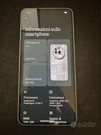 Vendo Nothing Phone (3a) Pro in ottime condizioni, sempre utilizzato con cura. Telefono perfettamente funzionante, fluido e affidabile, con design Nothing iconico. 🔋 Batteria Capacità massima: 100% 137 cicli di ricarica Batteria originale Primo utilizzo: 10/07/2025 ⚙️ Specifiche principali Processore: Qualcomm Snapdragon 7s Gen 3 RAM: 12 GB + 2 GB virtuali Fotocamere posteriori: 50 MP con OIS 50 MP 8 MP Fotocamera frontale: 50 MP Sistema: Nothing OS 4.0 (aggiornato) 📦 Condizioni estetiche Display e retro in ottimo stato Lieve segno sul bordo (visibile in foto), solo estetico e non influente sull’uso Nessun problema strutturale o funzionale 📸 Foto reali del dispositivo 👉 Ideale per chi cerca uno smartphone potente, originale e con batteria ancora come nuova. 📩 Per info o altre foto, contattami senza problemi
