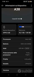 Salve vendo telefono Oppo a38 128 GB e 4 di ram compreso di caricatore e filo e cover il telefono e perfettamente funzionante e la batteria dello stato e al 100/100 e solo un po' scheggiato il vetro ma solo un pochino e di dietro ci sono solo delle piccole usature nere ma non e un problema lo vendo a 55 euro per chi fosse interessato mi scrivesse qui su subito.....