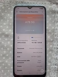 Oppo A78 5G condizioni ottime. Vendo Oppo A78 5G in condizioni ottime, perfettamente funzionante e tenuto con cura. 🔹 Memoria: 128 GB 🔹 RAM: 8 GB (espandibile virtualmente fino a 8 GB virtuali quindi 16 totali) 🔹 Display: 6.56" HD+ con refresh rate a 90 Hz 🔹 Fotocamera: Posteriore: 50 MP + 2 MP Frontale: 8 MP 🔹 Batteria: 5000 mAh con ricarica rapida 33W 🔹 Processore: MediaTek Dimensity 700 (fluido per uso quotidiano e gaming leggero) 🔹 Sistema: Android con ColorOS 🔹 Connettività : 5G, dual SIM 🔹 Extra: impronta digitale + riconoscimento facciale. Resettato e sbloccato. No caricatore e no scatola.
