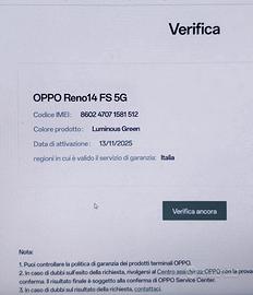Smartphone OPPO Reno 14 FS 5G – 12+12 GB di RAM e 512 GB di memoria interna in colore Luminous Green corredo completo, pellicola display e cover originale. Attivato 12/11/2025 in garanzia ITALIA fino a 12/11/2027.