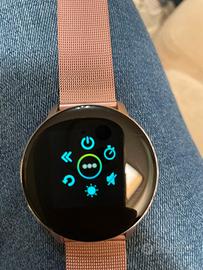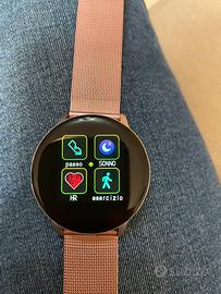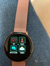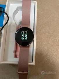 Vendo bellissimo smatwatch donna in perfette condizioni con due cinturini uno acciaio e uno in gomma, ha molte funzioni tra cui pressione sanguigna, ossigeno nel sangue visualizza chiamate messaggi, cronometro meteo e tanto altro.