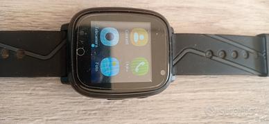 Orologio telefono per bambini nero. Completo di caricabatterie e vetrino di protezione. Ha diverse funzioni tra cui la modalità "scuola"