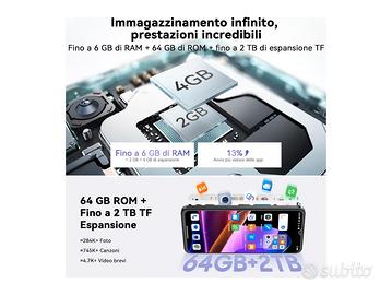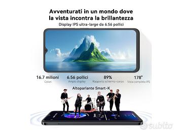 Si tratta di un modello recente, con Android 14, display ampio e luminoso da 6.56 pollici HD+, 64GB di memoria interna, 6GB di RAM espandibile fino a 6GB virtuali e supporto per scheda TF fino a 2TB.