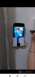 porta cellulare da parete con ganci per appendere altri oggetti, spazio per caricare senza toglierlo. con biadesivo molto forte.