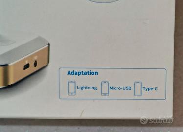 Power Bank magnetici con adattatori intercambiabili. Brandizzati Pago. Quattro pezzi, nuovi e in confezione originale. Base di ricarica e cavo dati inclusi. Design compatto e leggero.