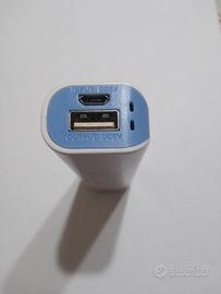 Power Bank 2600 mAh SAATCHITECH, di colore bianco e blu, In alto ha due porte USB Output DC5V, e Input DC5V.
