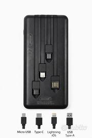 •Capacità 12000mA •Ricarica solare •Quick Charge 3.0 •Torcia LED integrata •Display digitale batteria •4 cavi integrati (Type-C, Micro USB, Lightning, USB) •Compatibile con smartphone, tablet e altri dispositivi •Portatile e pratica da viaggio •Protezione da sovraccarico e cortocircuito
