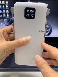 Powerbank con schermo informativo. Batteria ricaricabile da 20.000 mAh. Schermo indicatore del livello di carica rimanente sulla parte anteriore. Incorpora una torcia a LED per le emergenze, perfetta per viaggiare. Ha due uscite USB, una 5V-1A e l'altra 5V-2.1A, per caricare due dispositivi contemporaneamente. Contiene un cavo USB-Micro USB. Capacità: 20.000 mAh Uscita 1: 5 V / 1 A Uscita 2: 5 V / 2,1 A Ingresso: DC 5 V-1 A PVC Metal Alloy