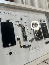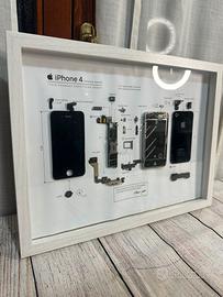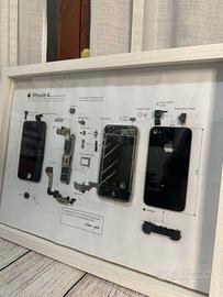 Vendo quadro decorativo con iPhone 4 completamente smontato, con tutti i componenti originali disposti su base grafica tecnica e inseriti in una cornice elegante color legno chiaro.