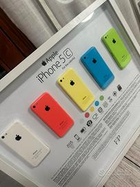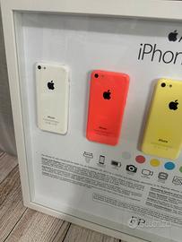 Vendo quadro decorativo dedicato a iPhone 5C, con tutte le colorazioni iconiche (bianco, rosso, giallo, blu e verde) disposte su base grafica tecnica originale e racchiuse in una cornice elegante color legno chiaro.