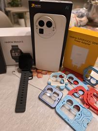 - Realme gt 8 pro White, 256 GB con 15 giorni di vita. - Realme Watch 5 nero con una settimana di vita. - Realme alimentatore originale 120w, Supervooc. - Realme Detachable Camera originale colore Blu in forma quadrata, con cover nera originale Realme + due chiodini. -Vari accessori detachable camera creati con stampante 3d perfettamente utilizzabili. -Cover trasparente compatibile con ricarica magsafe, di buonissima fattura presa su Amazon. -Cover originale nera a cerchio, cavo originale presenti.