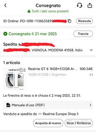 Vendo realme GT6 nella configurazione massima (16GB RAM / 512GB ROM). Dispositivo praticamente nuovo, usato meno di un anno, tenuto maniacalmente con cover e pellicola. Prestazioni da urlo, perfetto per gaming e multitasking pesante. SPECIFICHE TECNICHE: Processore: Snapdragon 8s Gen 3 (Potenza flagship). Memoria: 16GB RAM + 512GB ROM (Impossibile esaurire lo spazio). Display: AMOLED 6.78" Ultra Bright (6000 nits) - Visibilità perfetta al sole. Batteria: 5500 mAh con ricarica possibile SuperVOOC a 120W (0-100% in 28 min). Camera: 50MP Sony OIS (Foto e video professionali). CONDIZIONI E GARANZIA (Massima Trasparenza): Estetica: 10/10. Nessun graffio, mai caduto. Software: Versione Global con lingua italiana, Play Store e aggiornamenti OTA. Nota Garanzia: Acquistato su piattaforma internazionale (Temu). Per onestà segnalo che non è coperto da garanzia ufficiale Italia (L'IMEI del telefono non è registrato nel portale locale) cosa che ho scoperto solo dopo l'acquisto ma che non pregiudica il perfetto funzionamento del dispositivo. CONTENUTO CONFEZIONE: Smartphone realme GT6. Scatola originale. 3 cover in regalo come da foto di cui una base realme. 1 pellicola protettiva per schermo e lenti fotografiche posteriori. PREZZO leggermente trattabile viste le condizioni perfette del telefono. CONSEGNA: Scambio a mano (preferito per test live del prodotto) o spedizione sicura con TuttoSubito. No perditempo o offerte ridicole. Il telefono è un mostro di potenza.