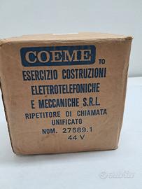 In vendita ripetitore di chiamata COEME (Costruzioni Elettrotelefoniche e Meccaniche S.r.l.), modello NOM. 27589.1 – 44V, dispositivo storico di produzione italiana, ideale per impianti citofonici/telefonici tradizionali o per collezionisti di elettronica vintage.