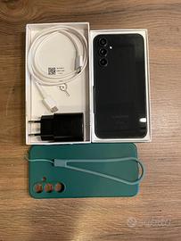 In vendita smartphone Samsung Galaxy A54 5G, colorazione Awesome Graphite. Modello esatto: SAM DS A546B GAL A54 5G 8+256 ITA BLK. Caratteristiche tecniche: Display FHD+ Super AMOLED 6.4 pollici, 8GB RAM, 256GB di memoria interna, supporto Doppia SIM, Batteria 5.000 mAh. Sistema operativo aggiornato all'ultima versione disponibile. Condizioni: Intatto esteticamente, eccellenti utilizzato con cura. Dispositivo acquistato a settembre 2024. Fornisco regolare ricevuta Amazon valida per la copertura in garanzia ufficiale residua. (altri 5 mesi circa di garanzia, fino al 13 settembre.) Inclusa scatola originale con dotazione di fabbrica. A disposizione per inviare fotografie di dettaglio. Accessori aggiuntivi disponibili separatamente: - Caricabatterie ufficiale Samsung Super Fast Charging con cavo USB C a USB C, disponibile per ulteriori 10 euro. - Cover protettiva verde con laccetto, disponibile per ulteriori 5 euro.
