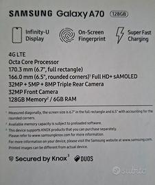 Smartphone Samsung Galaxy A70. Usato, perfettamente funzionante, senza graffi né difetti. Già resettato. Completo della sua confezione originale. In foto sia le caratteristiche che il prezzo d'acquisto da nuovo. Spedizione nella stessa giornata del pagamento!
