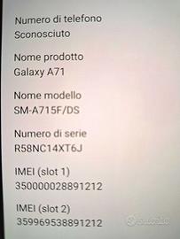 Samsung Galaxy A71 - 4G in perfette condizioni sia estetiche (utilizzato sempre con doppia cover - non ha graffi) che di funzionamento (perfetto e ripristinato allo stato di fabbrica) con auricolari,caricatore e scatola originali e istruzioni. Batteria ancora in buone condizioni (sempre caricato con limite 85% e MAI carica rapida). Omaggio cover posteriore.