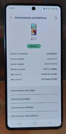 Smartphone Galaxy A71 con queste caratteristiche: display Super AMOLED Plus 6,7" 2400 x 1080; foto 64 Mpx (+5 Mpx + 5 Mpx + 12 Mpx); memoria 128 Gbyte; RAM 6 Gbyte; microprocessore Snapdragon 730 Qualcomm SDM730; Dual SIM; Slot per microSD; batteria LiPo 4500 mAh.