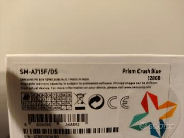 Usato in buone condizioni. Modello SM-A715F/DS 128 GB. Colore Prisma Crush Blue. Difetti : colore posteriore deteriorato, ma internamente, esternamente integro.