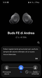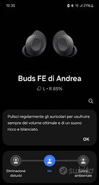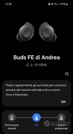 Vendo un paio di Samsung Galaxy Buds FE in ottime condizioni estetiche, acquistati nell'agosto 2025. Usati con moderazione e curati meticolosamente. Perché acquistarli? Ho personalmente testato la batteria per garantire la massima trasparenza (vedi screenshot allegati): * Durata del test: 120 minuti di riproduzione continua. * Impostazioni: Volume 50%, codec audio SSC (massima qualità), ANC disattivato. * Risultati: Carica iniziale 100% ➡️ 85% dopo 1 ora ➡️ 73% rimanente dopo 2 ore. * Stato della batteria: Eccellente, prestazioni pari a quelle di fabbrica. Caratteristiche principali: * Ottima cancellazione attiva del rumore (ANC). Bassi profondi e ricchi e suono nitido. Cuscinetto a "aletta" sicuro (perfetto per l'allenamento). Accoppiamento perfetto con l'ecosistema Samsung Galaxy. Inclusi scatola originale, custodia di ricarica e tutti gli accessori (gommini auticolari, alette auricolari e cavo di ricarica).