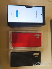 Vendo Samsung Galaxy Note 10+ con schermo rotto (come da foto) e ricarica wireless non funzionante, per il resto il telefono funziona perfettamente, Viene venduto nello stato di fatto in cui si trova, non si accettano resi, aggiungo due cover, una originale (nera) e l'altra non originale (rossa).